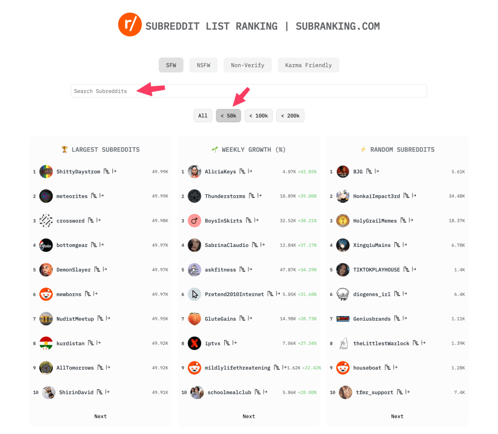 A useful trick we usually use to find small subreddits is using subranking.com and sort the results to see only subreddits under 50k subscribers.