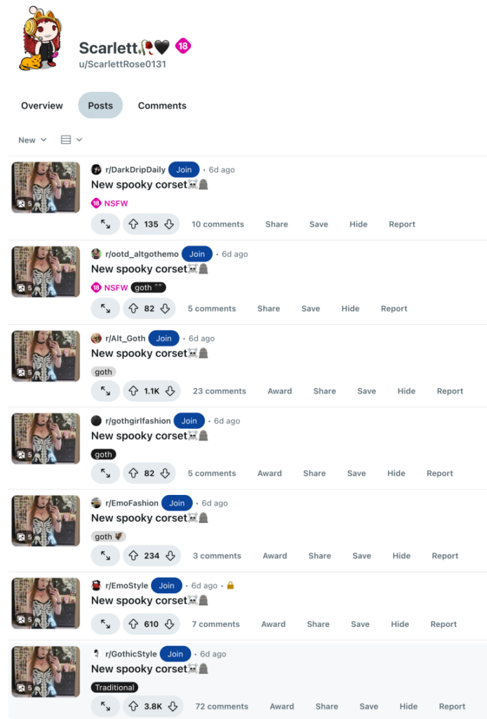 - Posting diversity (different subreddits, post types, and formats)