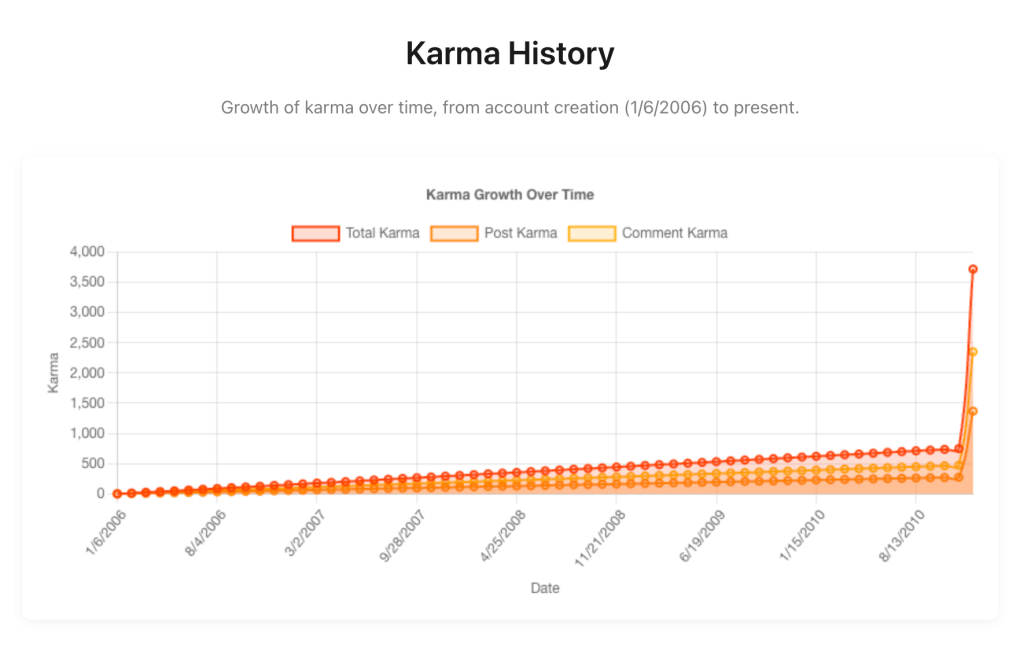 That sharp increase likely came from a viral post or a series of highly upvoted comments. A tool like this helps pinpoint exactly when a user gained attention.