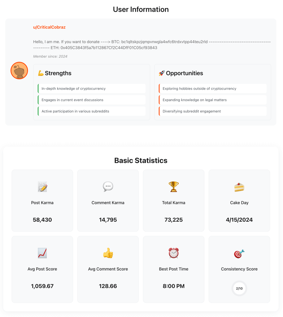 The tool breaks down activity into simple data points. These stats help you understand how a user interacts across Reddit, what kind of content they post, and how people respond.